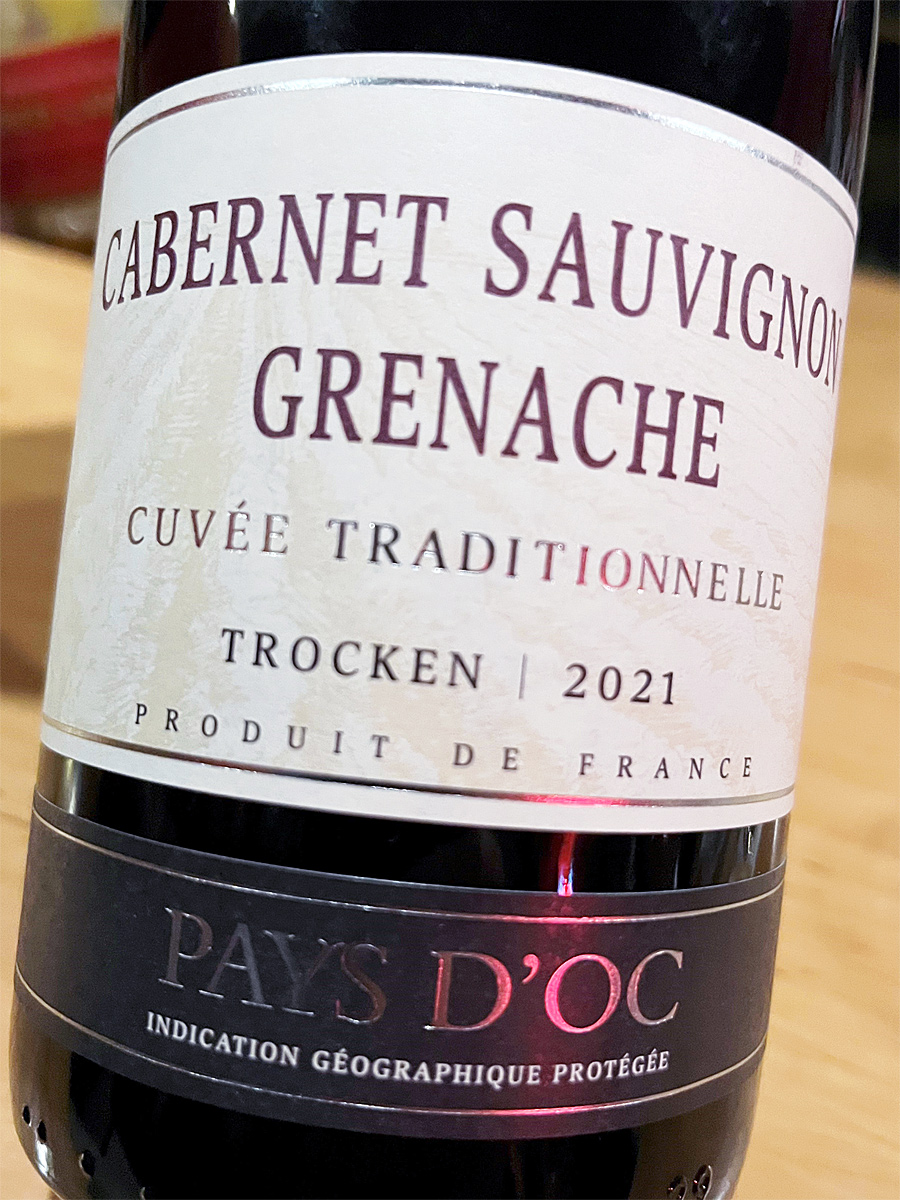 Gefällig, das 2021 Cabernet Sauvignon Grenache Cuvée Traditionnelle “Pays d’Oc” vom Cellier de Saint Jean, oftmals im Angebot bei LIDL für unter 2 Euro.